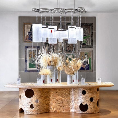 2019 年迈阿密巴塞尔艺术展上,巴卡拉宣布与美国艺术家维吉尔·阿布洛—Off-White 潮牌创始人、路易威登男装系列艺术总监—携手合作。巴卡拉晶莹剔透系列糅合了传统与创新元素,优雅与工业风格交织荟萃成超现代美学新典范。本系列的独特之处,在于水晶装饰链条大胆地悬挂在枝形吊灯元素以及精雕细刻的花瓶上。